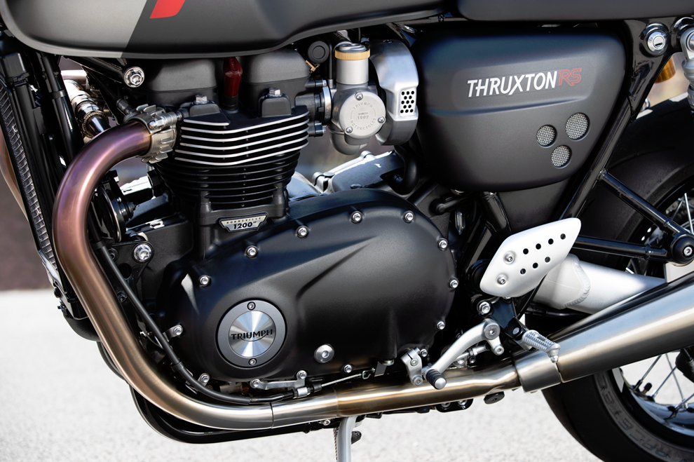 最新一代的ThruxtonRS,尽管变得更大、更强、更灵活、更安全,但是依然保持了复古格调。并列双缸已经进化到液冷时代,但这颗动力心脏仍然继承了大型散热片,采用黑色喷涂,并在边缘精细打磨,让冷酷的黑色与金属本色相互映衬。发动机的左右两侧,分别引出一只修长的喇叭筒式消声器,与并列双缸发动机前后呼应,烘托出上个世纪60年代的古典街车韵味。