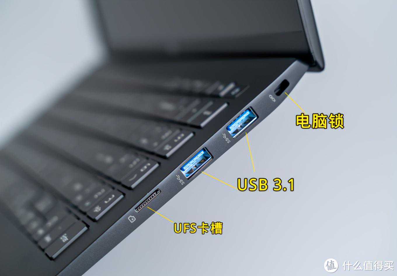 15、键盘的右侧接口,有电脑锁、2个、以及1个UFS卡槽。在这么轻薄的笔记本中,塞入几乎满足了各种需求的接口,再也不用带一个累赘的转换器了: