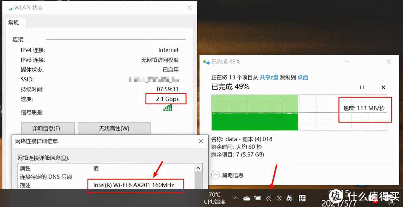 这个拷贝速度并没有跑满无线网卡的带宽,主要是因为在路由器只有千兆网口,瓶颈在路由器上。