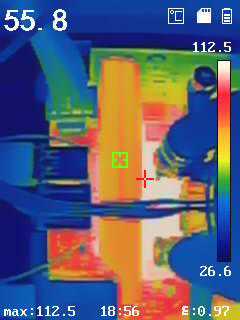 ▲但是此时电感附近的PCB温度已经高达112.5度,几乎依旧是顶在了温度极限,并且MOS附近的PCB也处于高温放进机箱铁定触发保护降频。