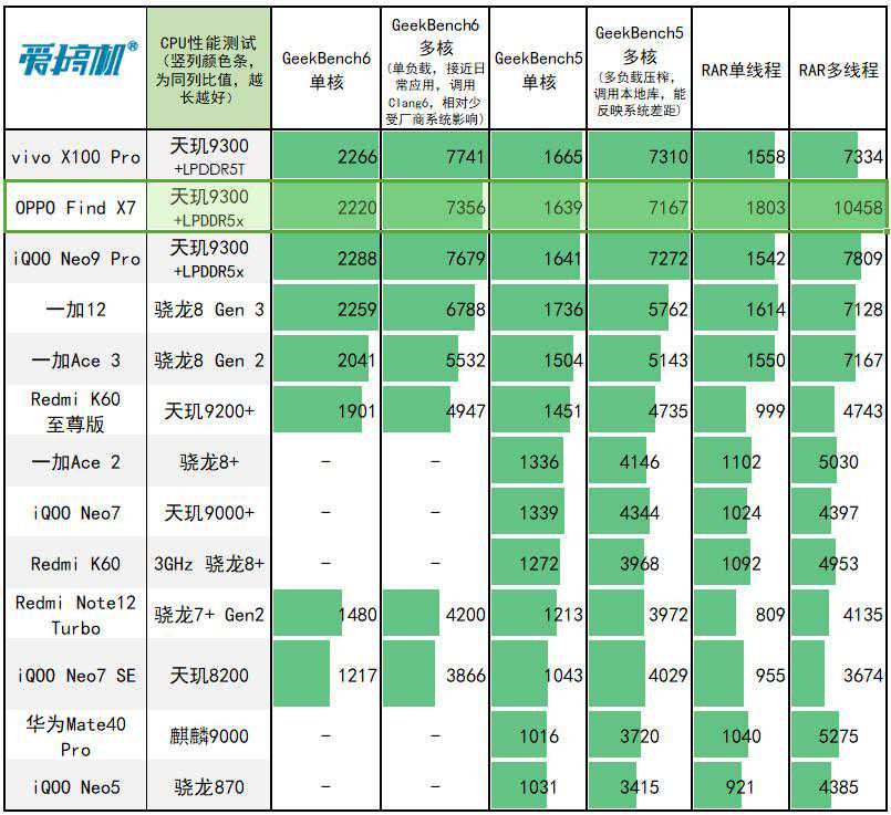 OPPOFindX7有几项测试的数据都远高于正常值,它是我们数据库中第一台RAR测试多核测试突破1万分大关的机器,大幅超过之前iQOO11S(8648分)留下的纪录。它的AndroBench闪存随机写入测试也是高得夸张,同样大幅超越旧纪录。
