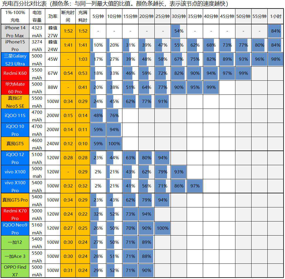(充电测试,1%开始。同一行的颜色条越长,速度越快↑。已打开vivo超快充电模式/OPPO智能极速充电/小米快充加速与低电疾充等功能。部分厂商/机型默认关闭相关功能,需手动开启)