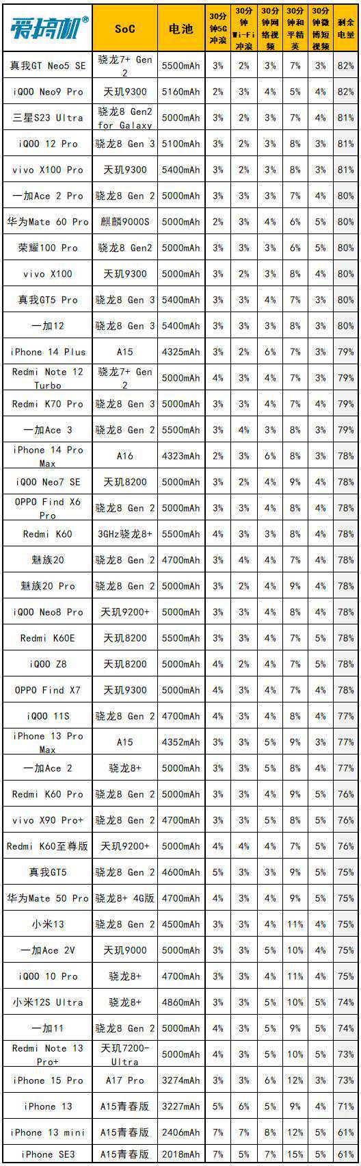 (充电测试,1%开始。同一行的颜色条越长,速度越快↑。已打开vivo超快充电模式/OPPO智能极速充电/小米快充加速与低电疾充等功能。部分厂商/机型默认关闭相关功能,需手动开启)