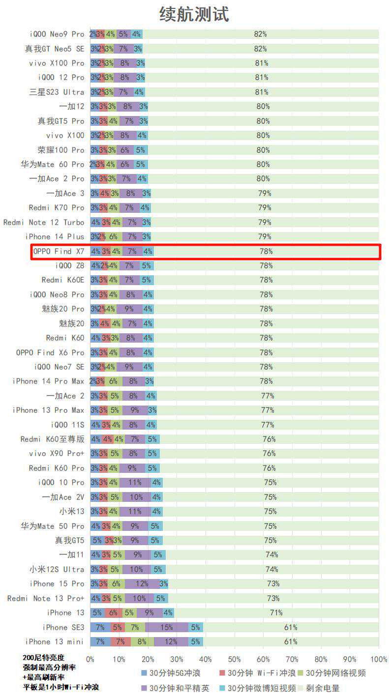 OPPOFindX7的5000mAh电池+1.5K屏,续航表现中等,打不赢2K屏配5400mAh的一加12,甚至比2K屏+5000mAh的K70Pro还弱一点。