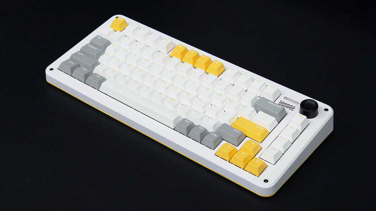 iQunixZX75重力波三模热插拔键盘采用了时下主流的75%配列搭配旋钮方案,键盘提供了81枚可用按键,拥有完整的F区、方向键区以及部分功能按键,在日常输入、游戏体验上还是能够满足大部分用户的使用需求的。机身尺寸346mm×151mm×44mm,对于空间占用也较为合理,对于小桌面用户,或是有外出携带使用需求的用户表现还是足够友好的。机身采用了较宽的边框方案,配合白黄灰三色键帽,也带来了较高的外观辨识度。机身整体采用塑料材质,表面处理带有轻微的哑光质感,配合四角外露的固定螺丝设计,在观感营造上还是非常不错的。