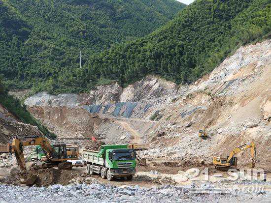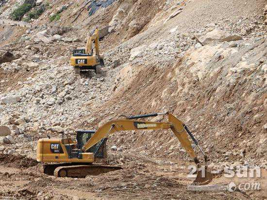 在不远处的山谷中,几台卡特彼勒挖掘机分散开来与碎石“战斗”着,首先将石块从岩壁剥离,然后破碎成小块,接着装车运走,场面虽繁忙,却也井然有序。