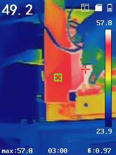 ▲最后来看一张红外成像,MOS散热块的表面温度为49.2度,略微烫手,这块散热块同时给电感进行散热,所以最热的地方转移到了CPU周边的PCB上。