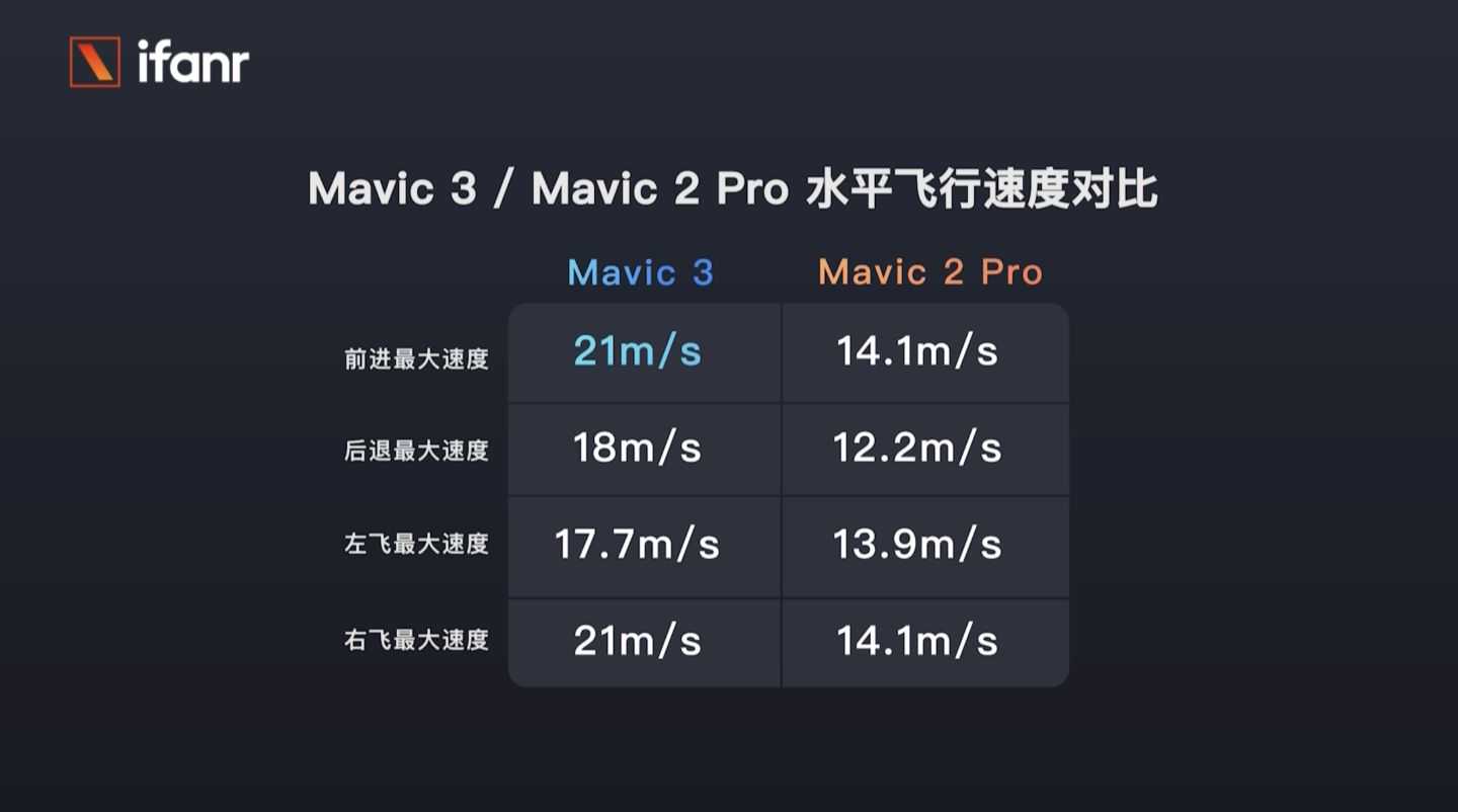 水平飞行的速度,最高能到每秒21米,约等于每小时75.6公里。Mavic2Pro最快只能达到每秒14.1米,约为每小时50.8公里的速度。
