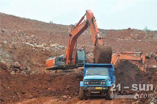 在露天金矿开采行业拥有丰富经验的蓝建样对南陵矿区机械开采作业进行了最优化的设计分配。除了日立5台20吨级液压挖掘机用来进行选矿翻堆及加固边坡的外围作业外,8台日立36吨级以上大型挖掘机全部被投入到了“工期紧”、“任务重”的采装作业,并发挥中流砥柱的作用。这8台产品中,“2台ZX-470、2台ZX-490用来采掘,4台ZX-360负责装车”,两车一组,一采一装,而跟随每组两台挖掘机联动的是6-8辆接踵而至的运输卡车。“三斗一车、装满即走,运输卡车不停,挖掘机就不能停。”蓝建样指着矿上一处开采作业点说到。