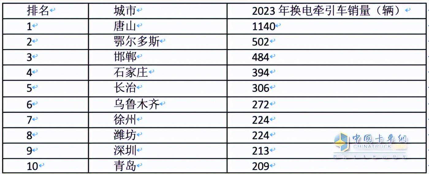 上表可见,换电牵引车的主销城市是唐山、鄂尔多斯、邯郸、石家庄、长治等城市。