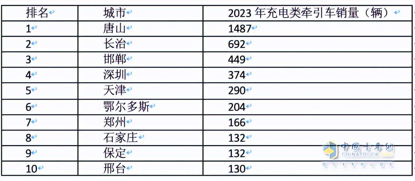 上表可见,普通充电类纯电动牵引车的主销城市是唐山、长治、邯郸、深圳和天津等城市。