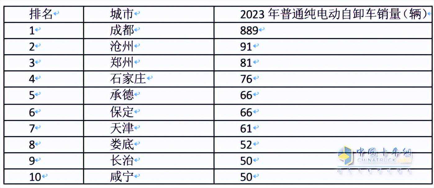 上表可见,普通纯电动类自卸车主销城市是成都、沧州、郑州、石家庄、承德、保定等城市。