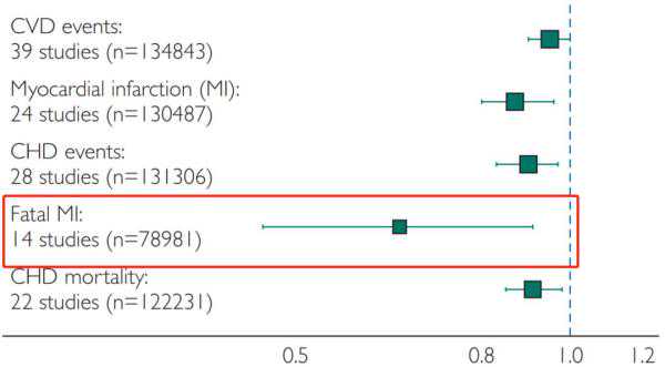 与心梗风险降低13%有关(RR,0.87;95%CI,0.80-0.96);