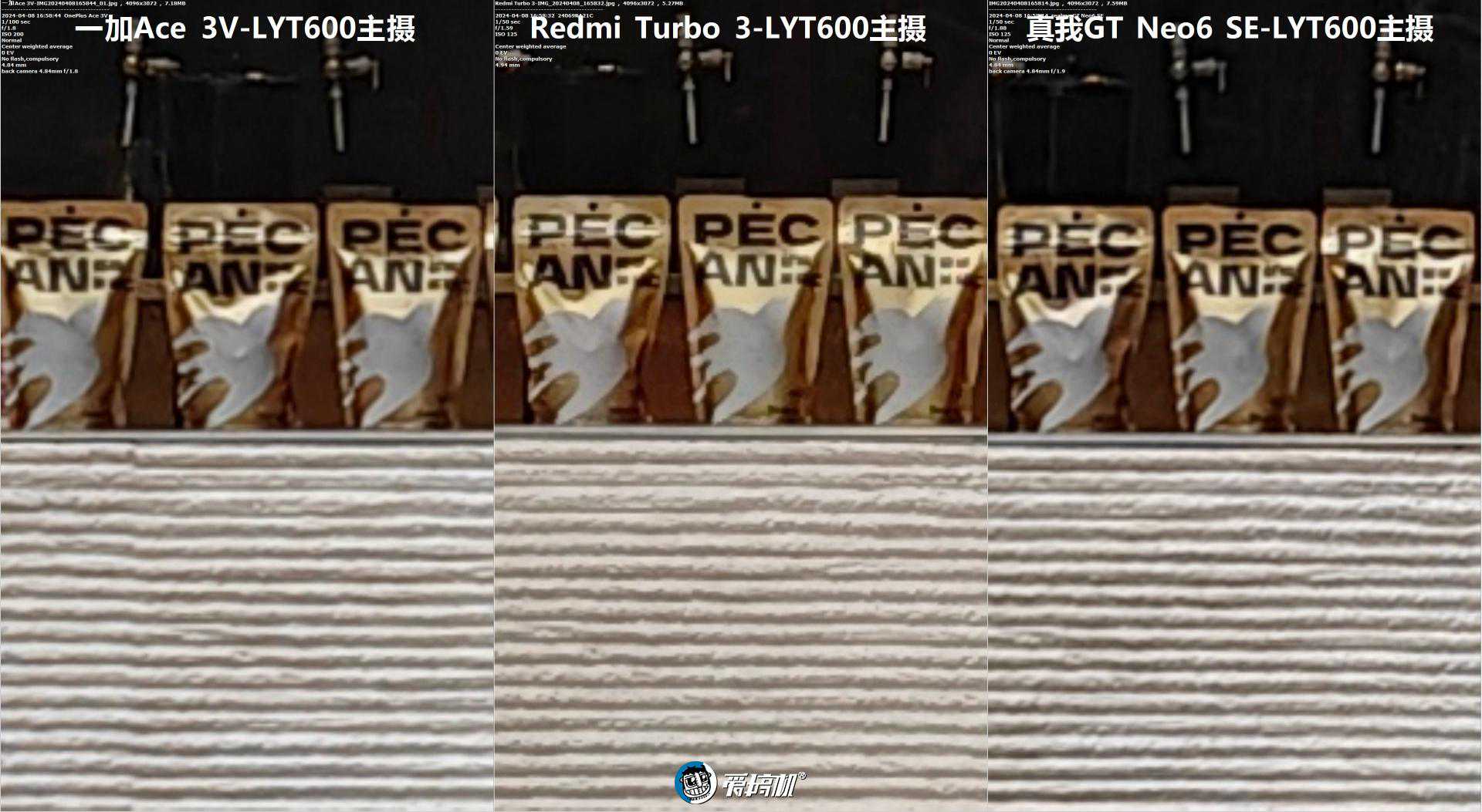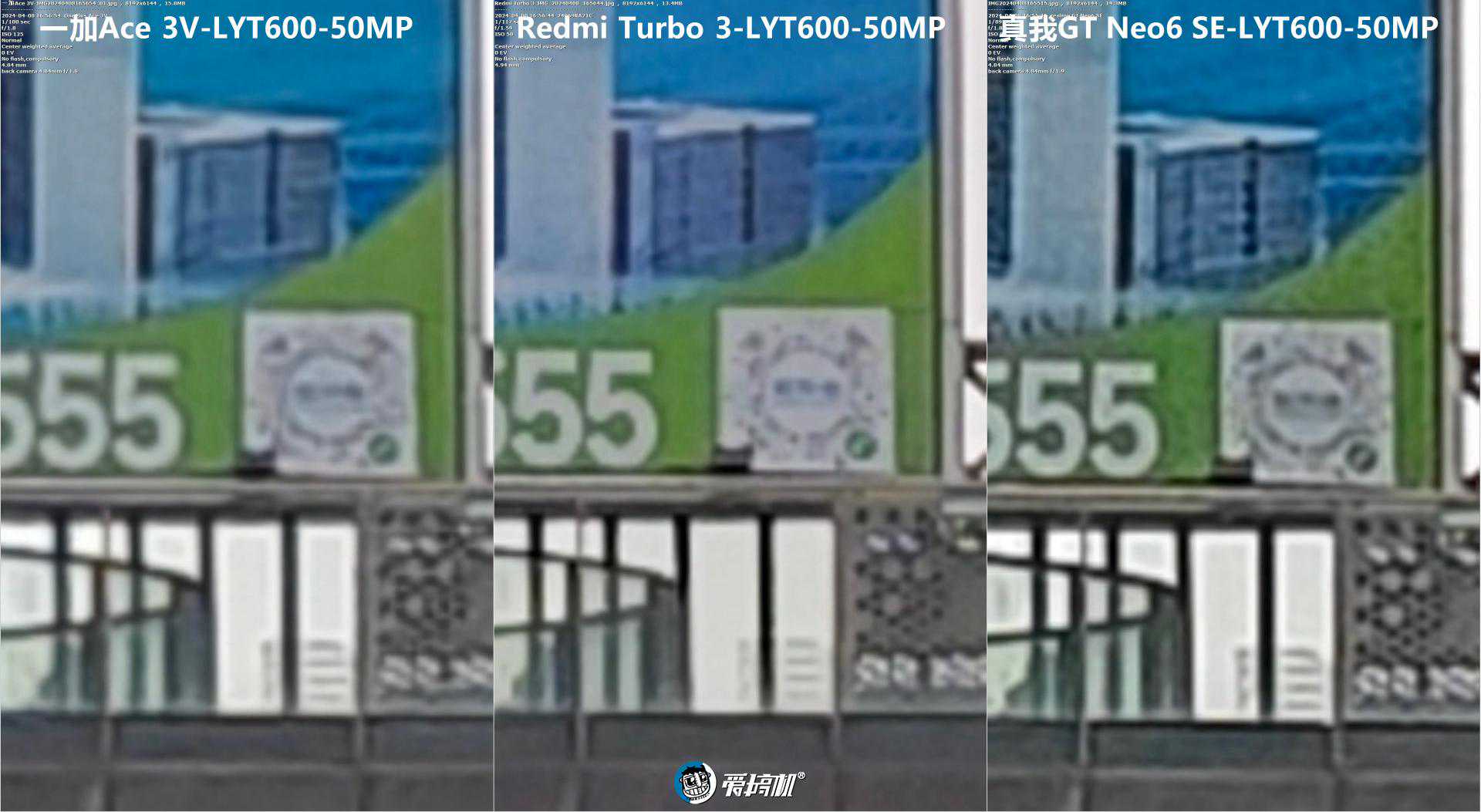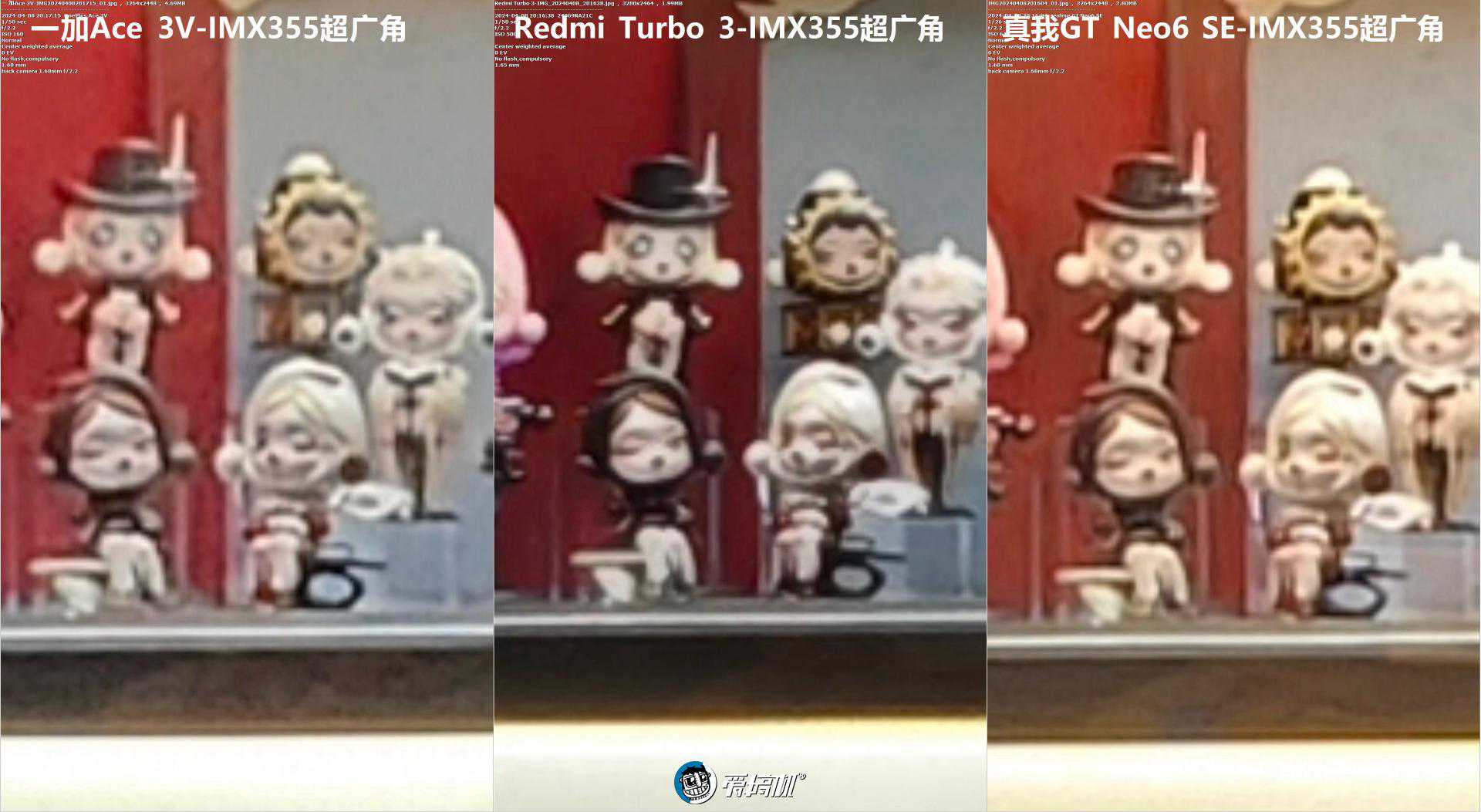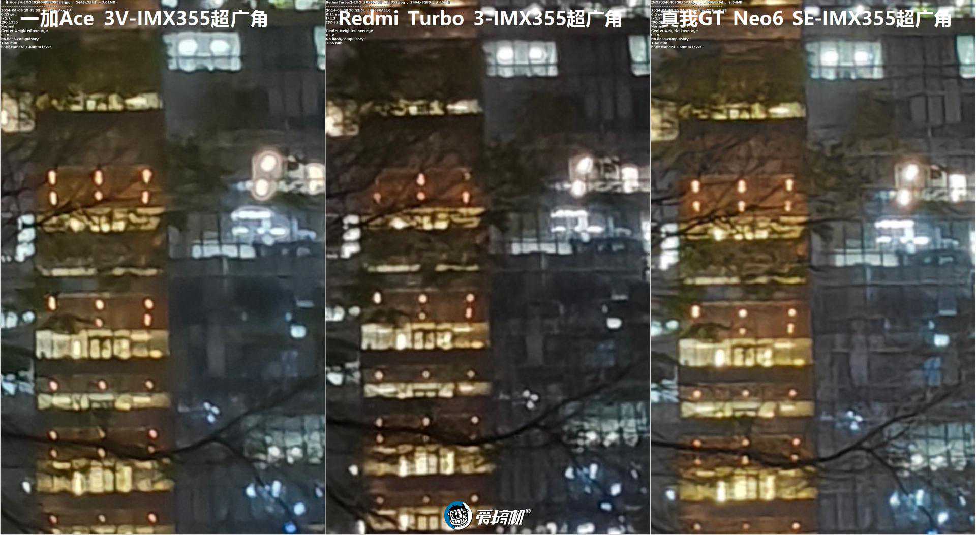 虽然都是一样的传感器,但配的镜头不太一样。RedmiTurbo3主摄是光圈,一加Ace3V是,真我GTNeo6SE是。而超广角上,真我和一加接近,Redmi的视角要广一点(镜头焦距短一点)。