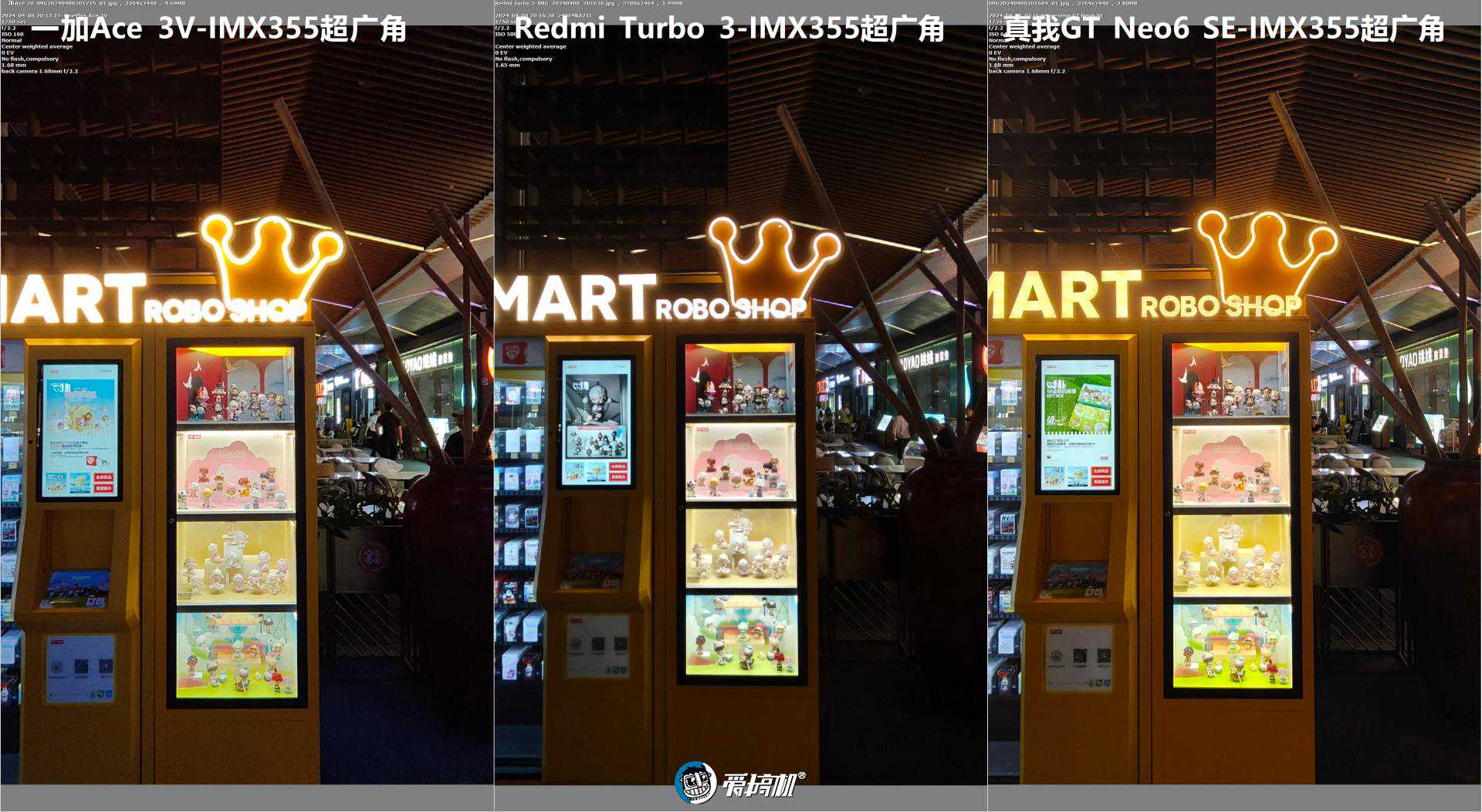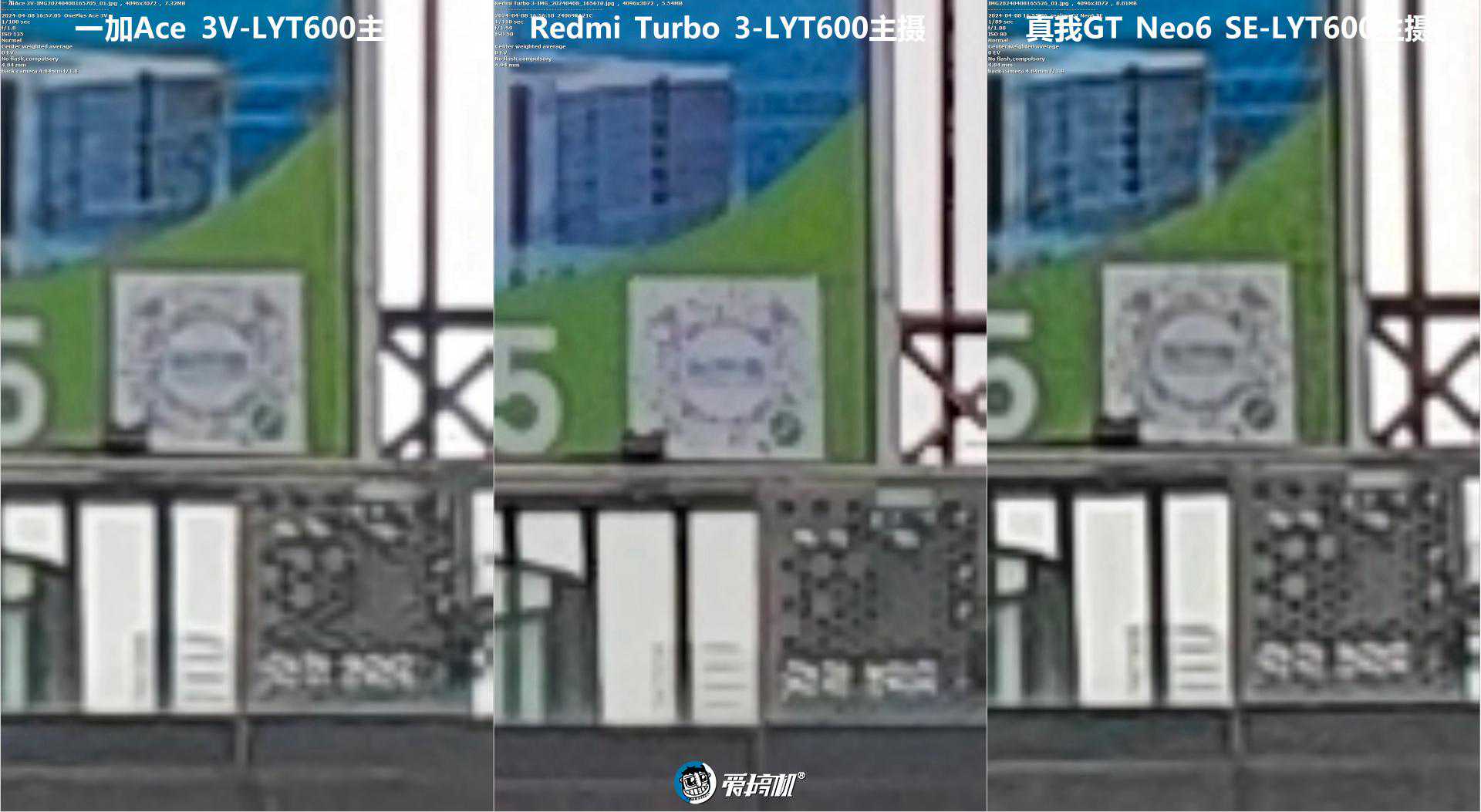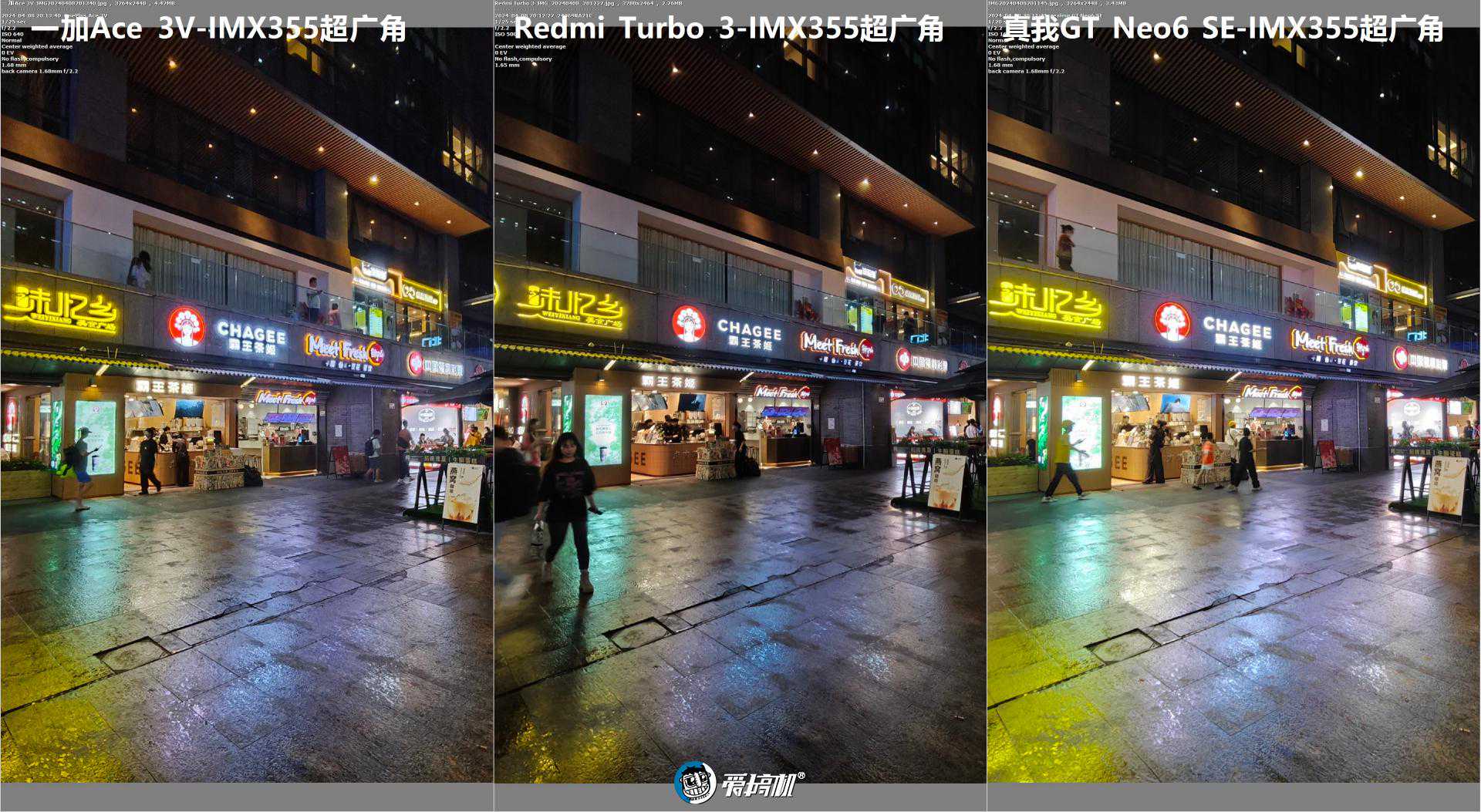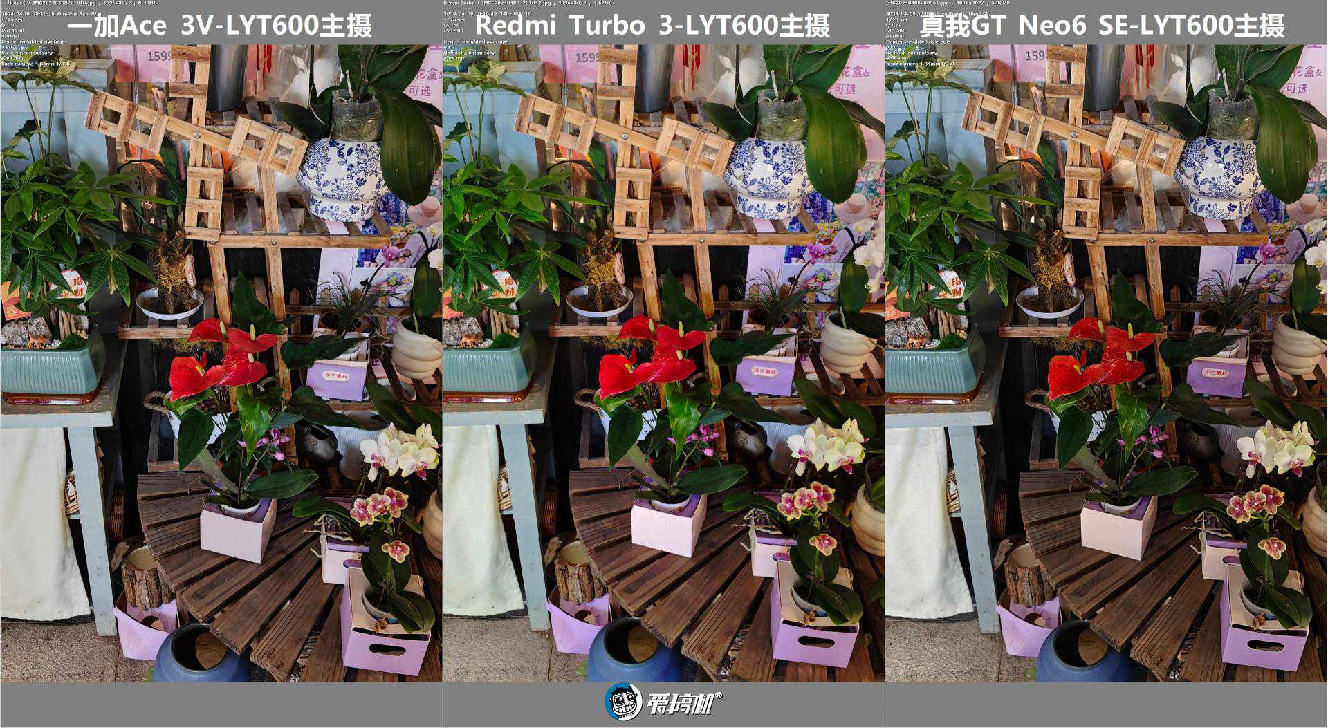 虽然都是一样的传感器,但配的镜头不太一样。RedmiTurbo3主摄是光圈,一加Ace3V是,真我GTNeo6SE是。而超广角上,真我和一加接近,Redmi的视角要广一点(镜头焦距短一点)。