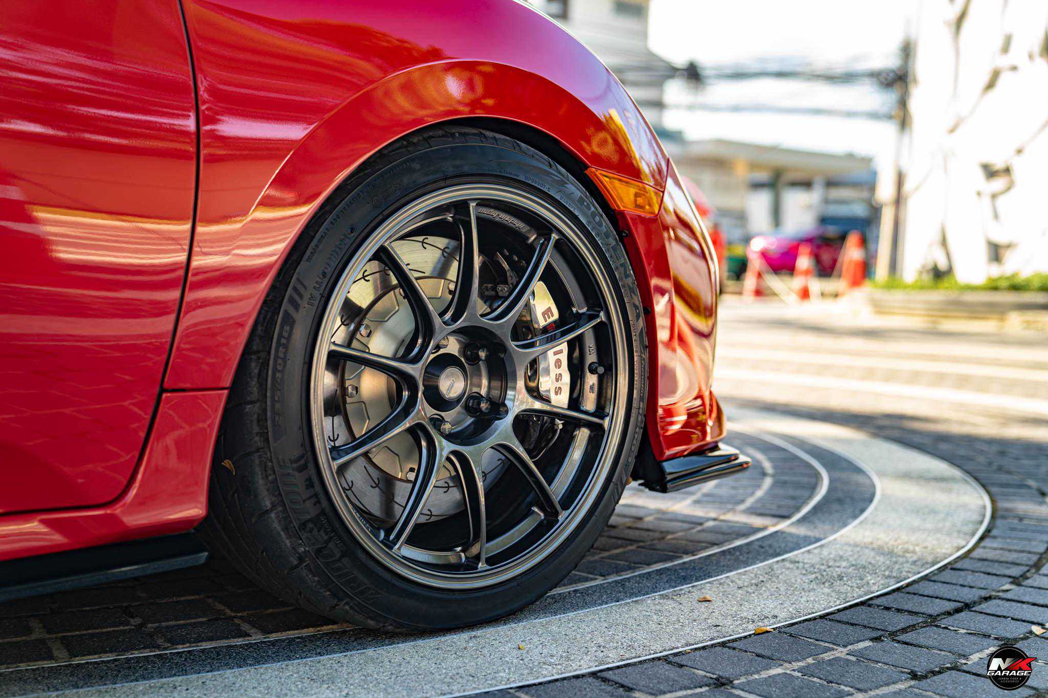 18英寸灰色细辐条轮圈非常有JDM的味道,内部则是less的刹车卡钳和划线刹车盘,轮胎则是来自普利司通的搏天族RE003,规格为235/40R18。