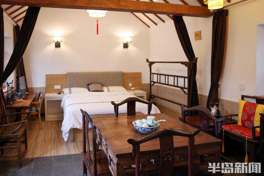 “我们的先辈通过南货北调积攒了第一桶金,然后回乡建了一些具有北方特色的四合院,现在留存的还有不少,原本在外工作的我,乘着乡村振兴的风,回到生我养我的地方,开设了这家民宿,也是为了保留历史传承、保留乡愁。”福海乡居民宿主人韩乃涛介绍。伴随着记忆中的开锁开门声、经过传统的木门走进福海乡居,一股古朴风迎面而来,灰砖灰瓦、格床翠竹,三个精品院落。古朴的建筑加上年代感的陈设,雕梁画栋、挺脊翘檐、古意浮现。