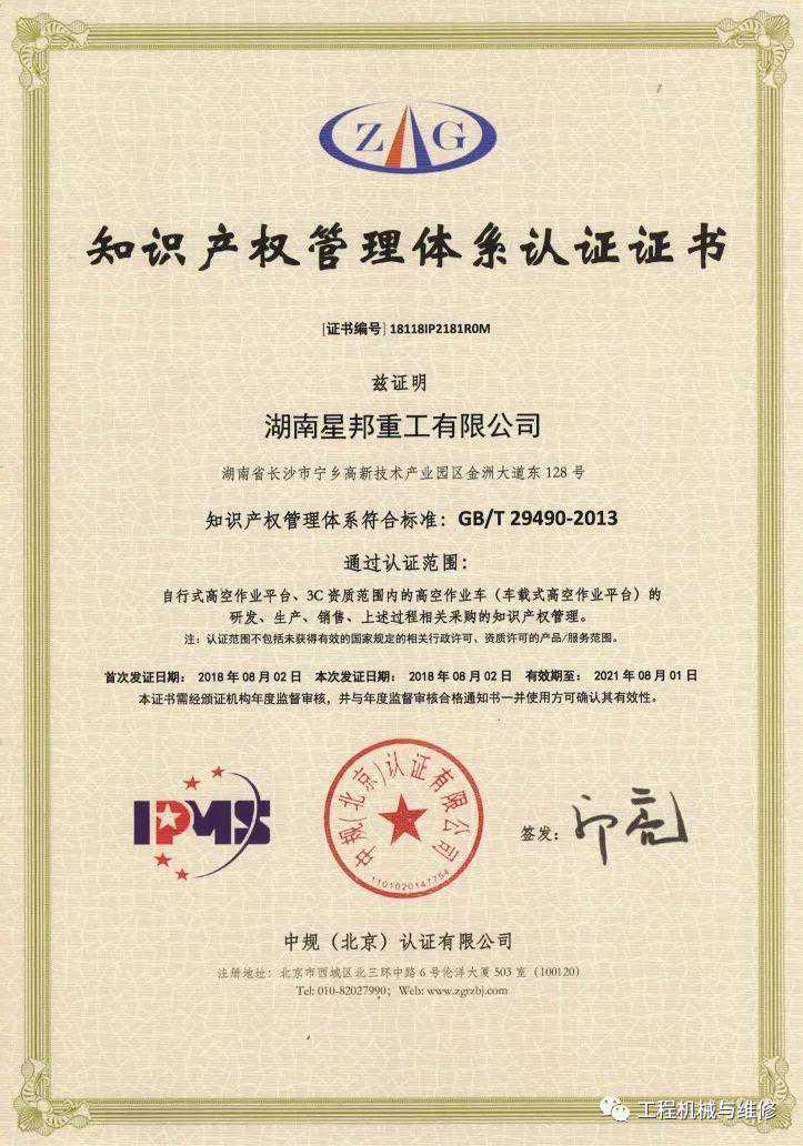 湖南星邦重工有限公司于2018年8月02日正式获得由中规(北京)认证有限公司颁发的《知识产权管理体系认证证书》(证书编号:18118IP2181R0M),这标志着我星邦在知识产权创造、运用、管理和保护方面全面迈入国内领先水平。