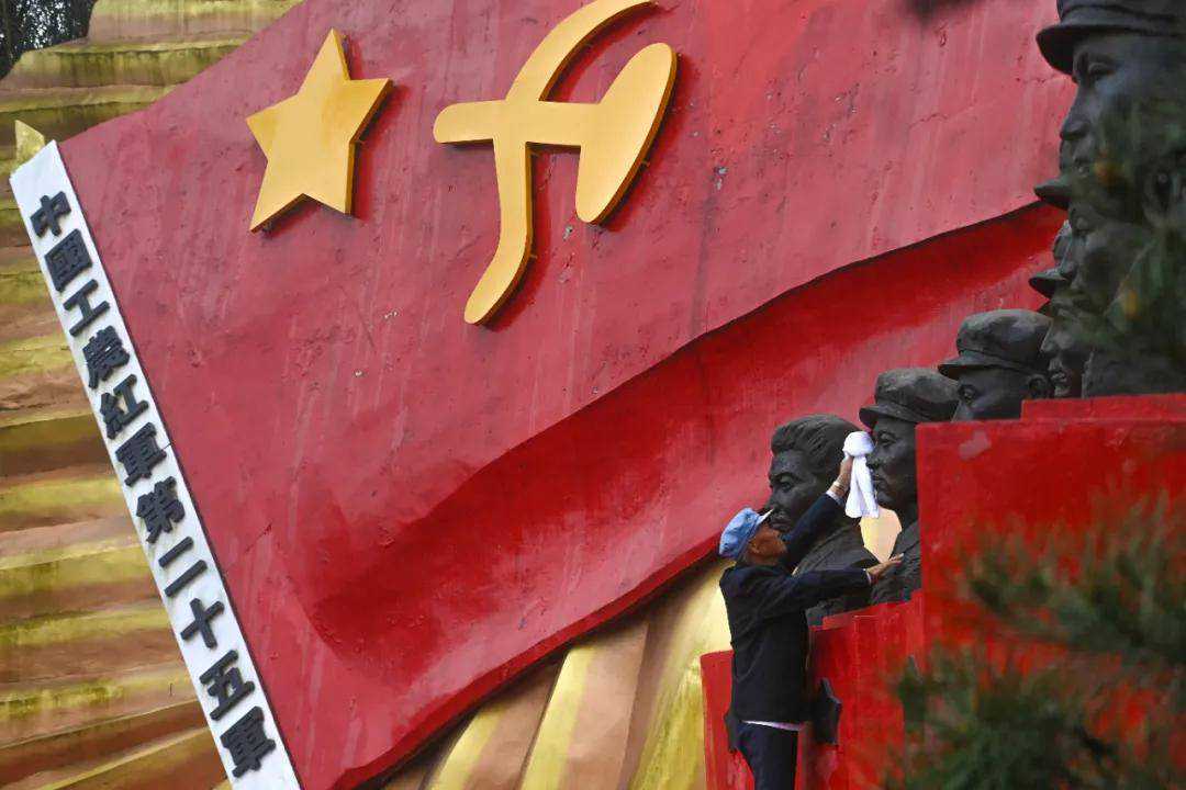 修缮后的红军广场上矗立着6座红军铜像,王茂贵几乎每天都会擦拭这些铜像。