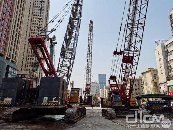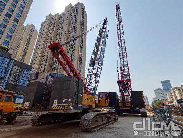 沿蒙城路一路向南,远远就能看到三台三一履带起重机矗立在高楼间,格外显眼。SCC550C负责工地上料,SCC1250负责其他吊载作业及配合,SCC2600A负责吊载并安装钢筋笼,三台设备各司其职,井然有序。