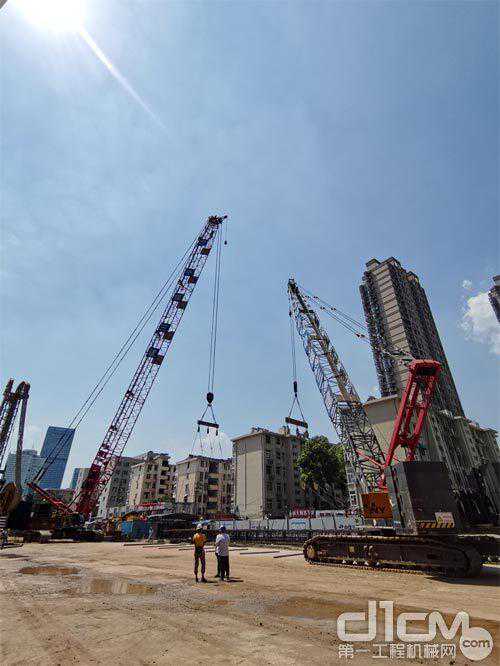 2020年9月4日,北一环路站项目工地上预备备安装40吨重的钢筋笼。前期需要将焊接好的钢筋笼转移空旷的地方,SCC1250和SCC2600A相互配合,随着指挥员的哨声响起,吊钩缓缓上升,40吨的钢筋笼被稳稳吊起,动作一气呵成。