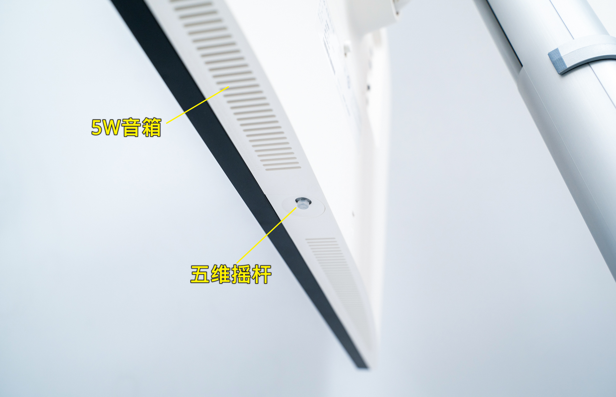12、在显示器的底部,内置了5W的大功率音箱、还有一个五维摇杆: