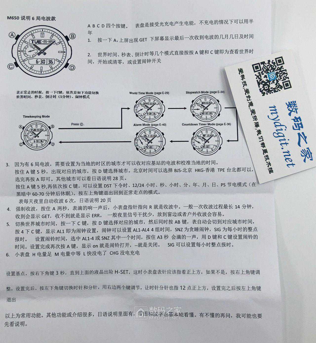 因为是日版,所以找不到中文说明书,经过对比发现与卡西欧5054机芯操作相似,可以参考。
