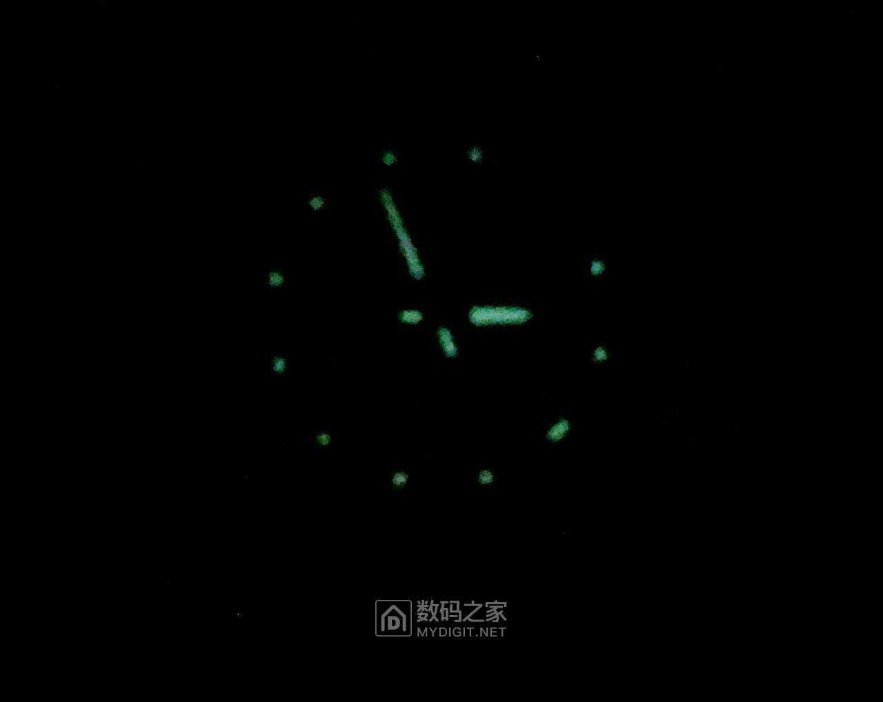 表针与字钉涂有荧光粉,夜晚能发出荧光,俗称"夜光表",这样在夜里也能看时间。下图是在全黑环境下用手机拍的。