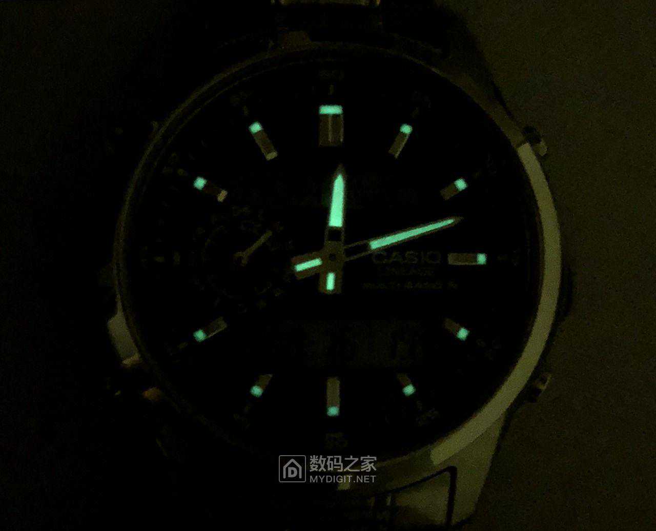 想起自己小时候,爸爸买了一块上海机械表,也能发出夜光。那时候听说荧光粉有辐射,所以许多人睡觉的时候都会把手表脱下来放在旁边,毕竟安全是大家都关心的事情。我也特意测试了一下,将手表放置在暗处几个小时之后,表针就不发出荧光了(如下图)。说明卡西欧手表盘上的夜光指针是采用蓄光型夜光材料,可以放心使用。