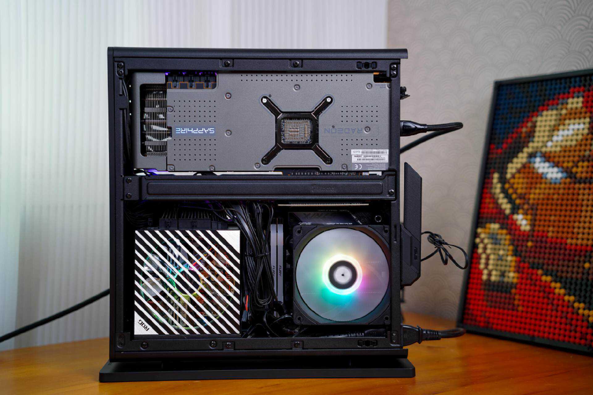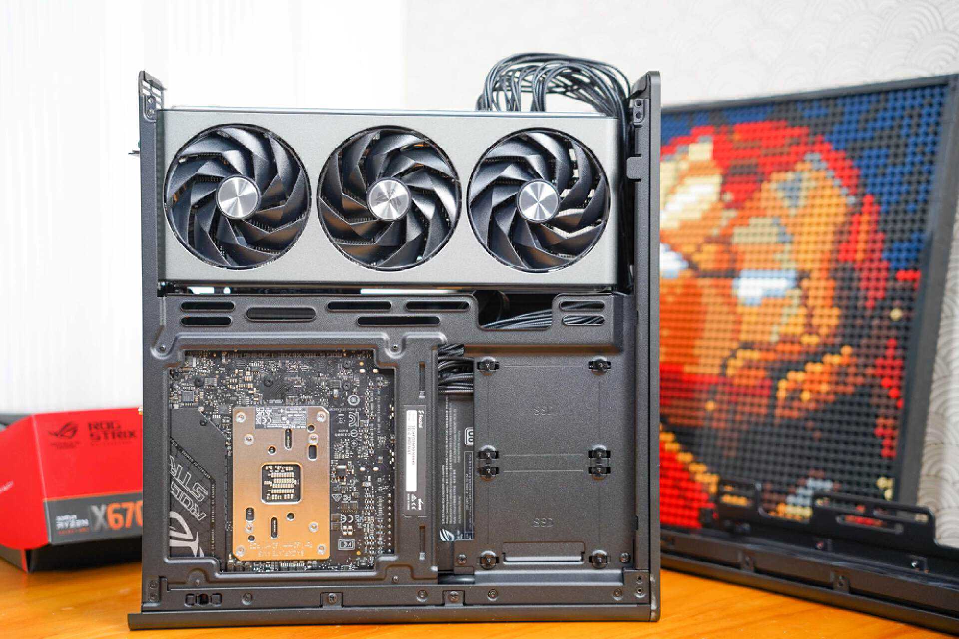 机箱整体可玩性还是非常强的,比如下图这样。这样把显卡位顶盖安装之后就可以实现像是蓝宝石RX7900XTX超白金这样320mm超长显卡的安装。