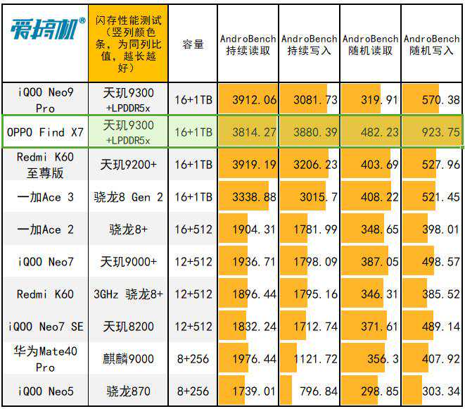 OPPOFindX7有几项测试的数据都远高于正常值,它是我们数据库中第一台RAR测试多核测试突破1万分大关的机器,大幅超过之前iQOO11S(8648分)留下的纪录。它的AndroBench闪存随机写入测试也是高得夸张,同样大幅超越旧纪录。