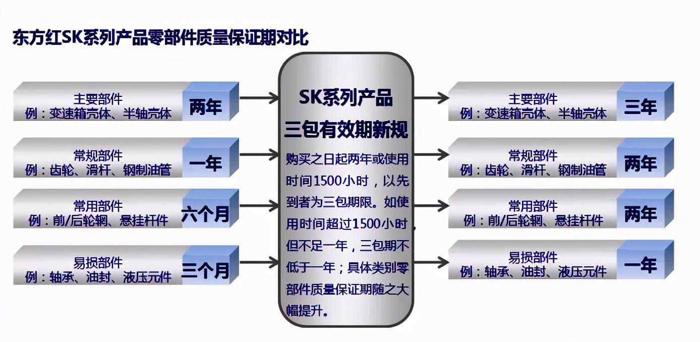 一、东方红SK系列拖拉机延长三包服务期主要内容至“购买之日起两年或使用时间1500小时”,同时对主要部件、常规部件、常用部件和易损部件的三包期相应延长。