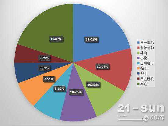从吨位上看,5≤a≤6区间的小挖销量最好,全年共销售2100台,占比达到29.1%;19.5<a≤24.9区间的中挖销量为1316台,占比为18.2%;6<a≤13区间的小挖销量为1193台,占比16.5%。此外,35≤a≤39.9和30≤a≤34.9区间的大挖共销售1000余台,合计占比达到14.6%。