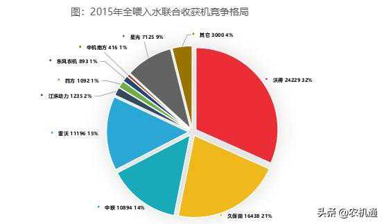 三、2015年:行业仍放量增长,沃得强势崛起,行业竞争格局巨变2015年是国内农机行业的分水岭,这一年之后,行业结束了黄金十年,很多细分子行业由盛转衰,但全喂入水稻联合收获机行业是个例外。