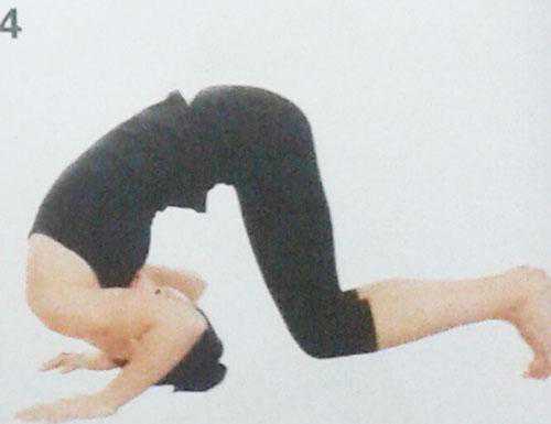 4、双肘向下压,翻滚头部,同时弯曲双膝,脚趾抵在地面上。