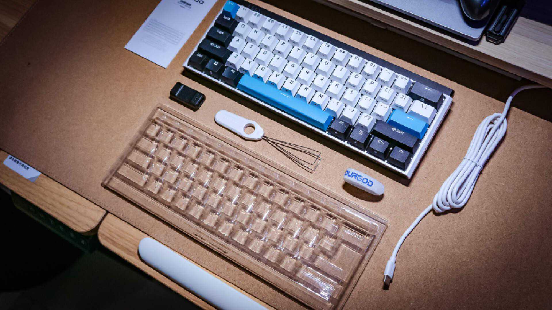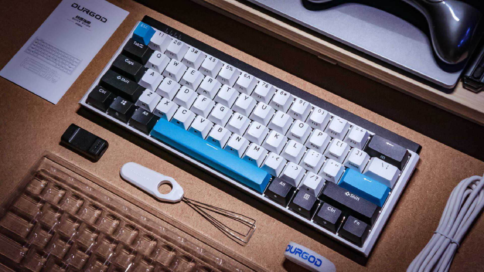 产品全家福简单明了:键盘主体、键盘防尘盖、USB-AtoType-C数据线、转接头、拔键器、拔轴器。心细的老用户会发现这其中缺少了杜伽招牌式的杯垫,是不是呢?