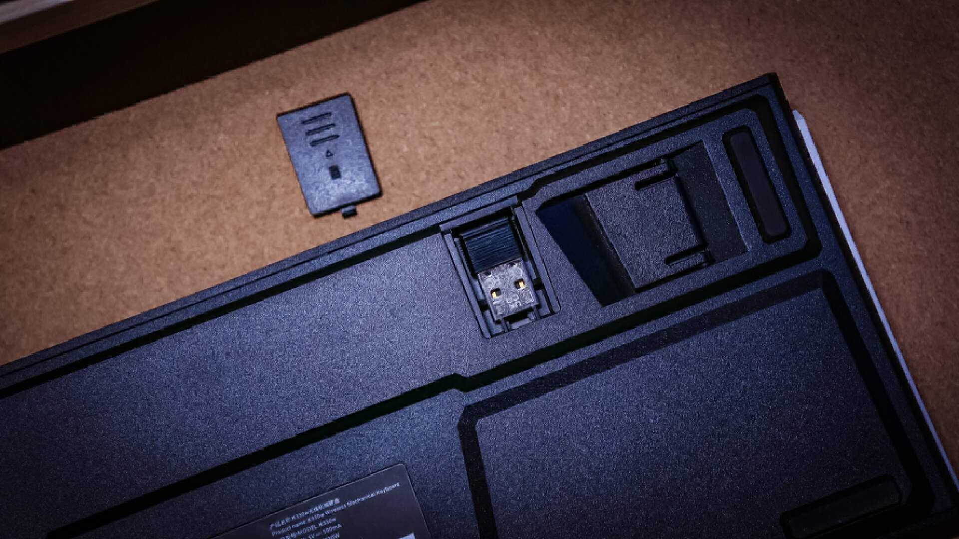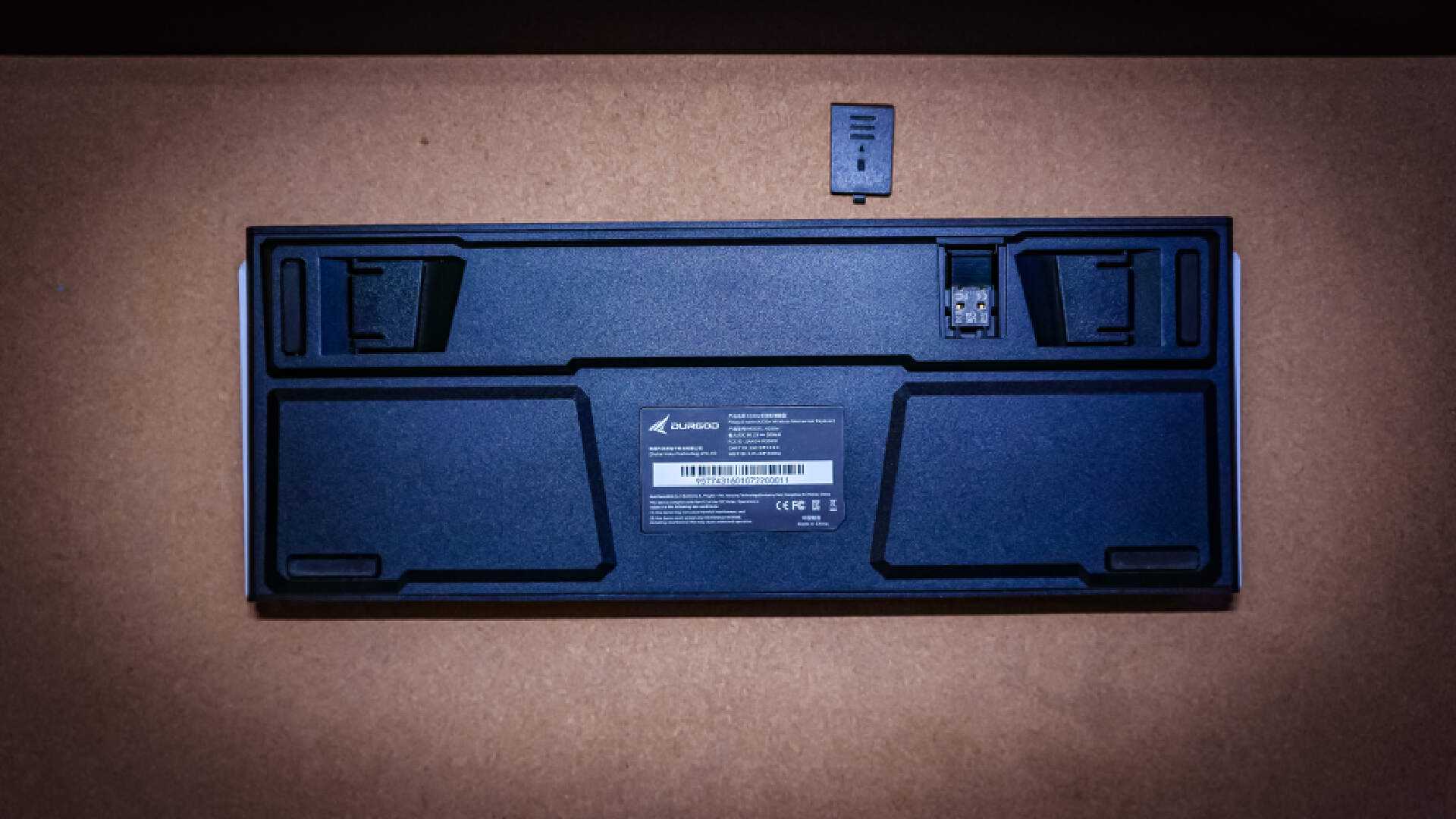 底部除了撑脚外还安放了2.4GHz接收器,接收器就藏着这个小盖板下方。整个底壳部分的造型偏向于机甲风,虽然高度方面只有一段可调,但是键盘自身的角度就很舒服了,只需加个掌托即可享受丝滑的敲击手感。