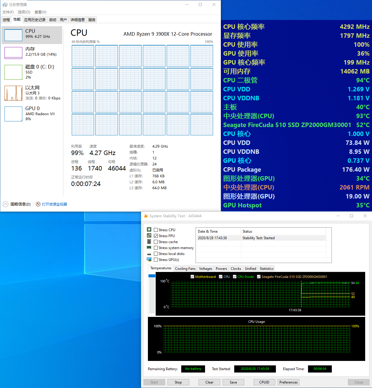 ▲进入系统,对这颗1.3的3900X进行20分钟的FPU烧机,可以观察到,在烧机的时候,这颗超频后的3900X功耗在176.40W,核心电压有掉压的情况,不过相对技嘉好多了,后面可以通过BIOS进行优化。