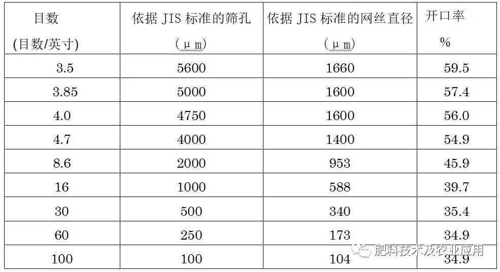 表1.化肥中常用标准筛JIS标准及其参考特性值