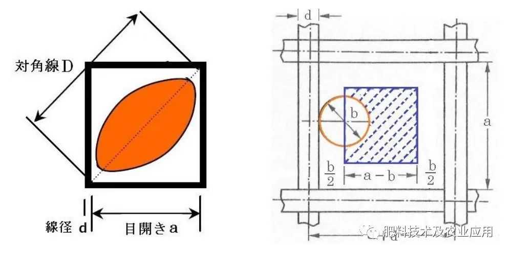 常用化肥筛网是由铁丝编织成的正方形孔。如图2所示,筛丝直径为d,筛孔为a,对角线的长度为D=√2a。如果颗粒为近球形,则直径为b,理论上只有小于网孔a的颗粒才能通过筛网,但对于椭圆、圆柱或棒状的颗粒,其短径小于网孔对角线D的颗粒,即b√2a,也能通过筛子。