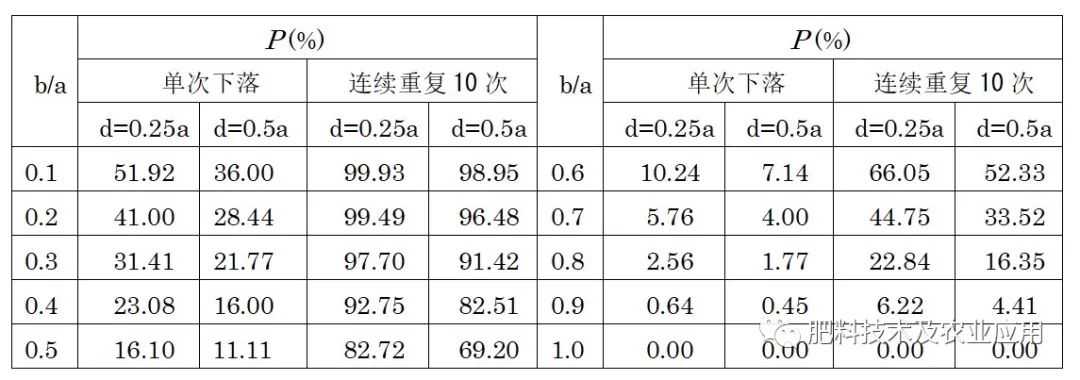 根据上述公式,当筛网孔径(a)较大,线直径d和颗粒直径b较小时,颗粒通过网眼的概率变得更高。表2展示了具有不同粒度(b)的球形颗粒通过筛网的概率P,其中线直径(d)与筛网直径(a)的比率设定为0.25和0.5,表中展示单次下落和重复连续下落10次的概率。