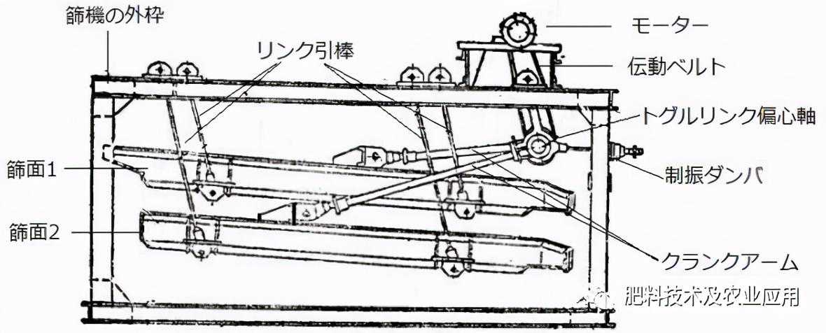 图16是以往复方式进行直线运动的平面回旋筛分机的结构轮廓。电机带动拨动连杆的偏心轴旋转。作为传动机构,电机通过传动皮带、皮带轮带动拨动连杆的偏心轴旋转。拨动连杆将旋转力转化为水平滑动力,使筛面直线往复。图17所示为实际的平面回旋筛分机的照片。