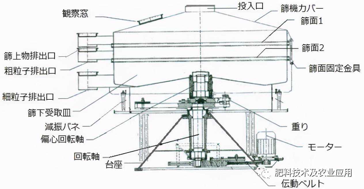 旋振筛的筛面为圆形,由电机、偏心转轴和弹簧组合而成。电机、偏心转轴和弹簧的组合,使筛分机作二维旋转运动.通过调整偏心转轴的相位和弹簧的位置,筛子不仅可以进行圆周运动,还可以进行筛子左右摆动的立体运动。进料物体从筛面中心向边缘侧滚动,同时以螺旋运动方式旋转,并通过筛网。此种震动方式对颗粒的冲击力非常小,适合分离脆性颗粒。分类精度高,最适合高附加值产品的分类。但缺点是规模难以扩大,分离效率和生产效率都要逊色一些。它常用于药品和食品的筛分。图18和图19是结构的轮廓和实际产品的照片。