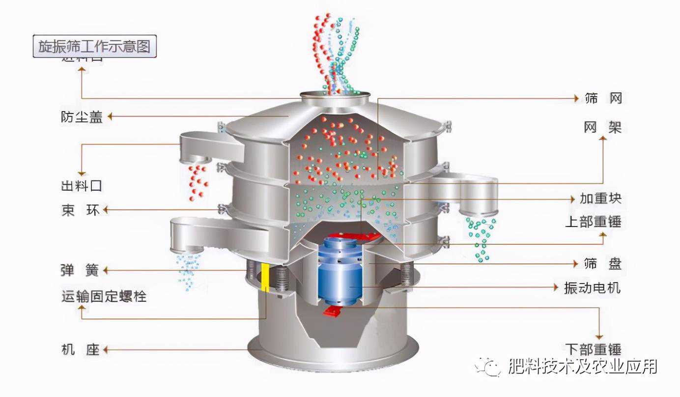 在肥料领域,出于以下原因,往往在施用前将肥料制作成一定粒径的颗粒:调整肥料成分,供应不同类型作物及不同生长阶段所需养分,配合机械施肥,防止施肥过程中粉尘飞散,改善肥料性能和延长肥效,防止储存过程中因吸湿和重压而凝固。造粒后,为了分离和除去过大\过小粒径颗粒,并将符合规格的肥料颗粒作为产品装运,筛分过程必不可少。