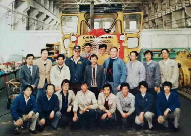 1986年开始引进卡特彼勒技术,直到1991年第一台D7G200马力推土机样机组装成功后,以下是D7G组和部分工艺技术人员同卡特彼勒公司专家一起合影留念。