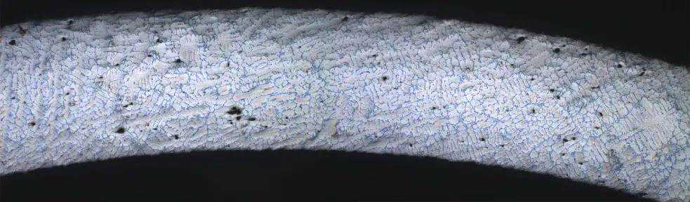 金相组织为α-Al+共晶Si+含Fe相,其中共晶硅粗大且呈条片状,根据JB/标准,该试样属于未变质或变质不足。金相观察发现试样中存在一些枝晶间缩孔(显微缩松),通过定量金相分析二次晶臂间距值约为0.3mm。