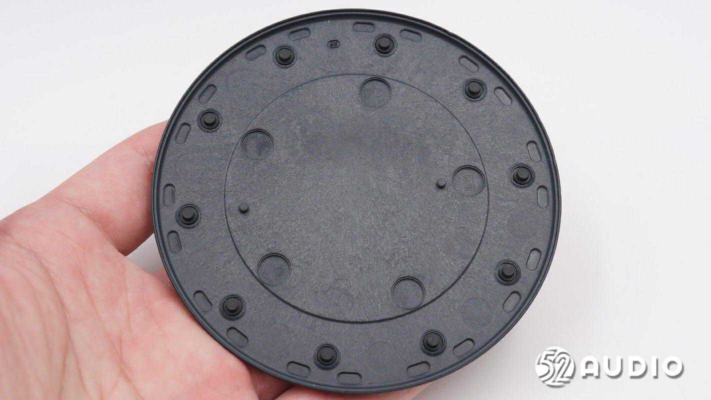 底板内侧结构一览。底板中间使用双面泡棉胶固定在法兰盘上,外围可见10颗橡胶柱(双面胶固定可取下)用于缓震。