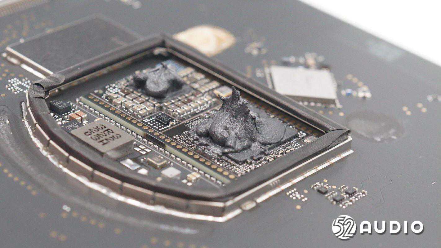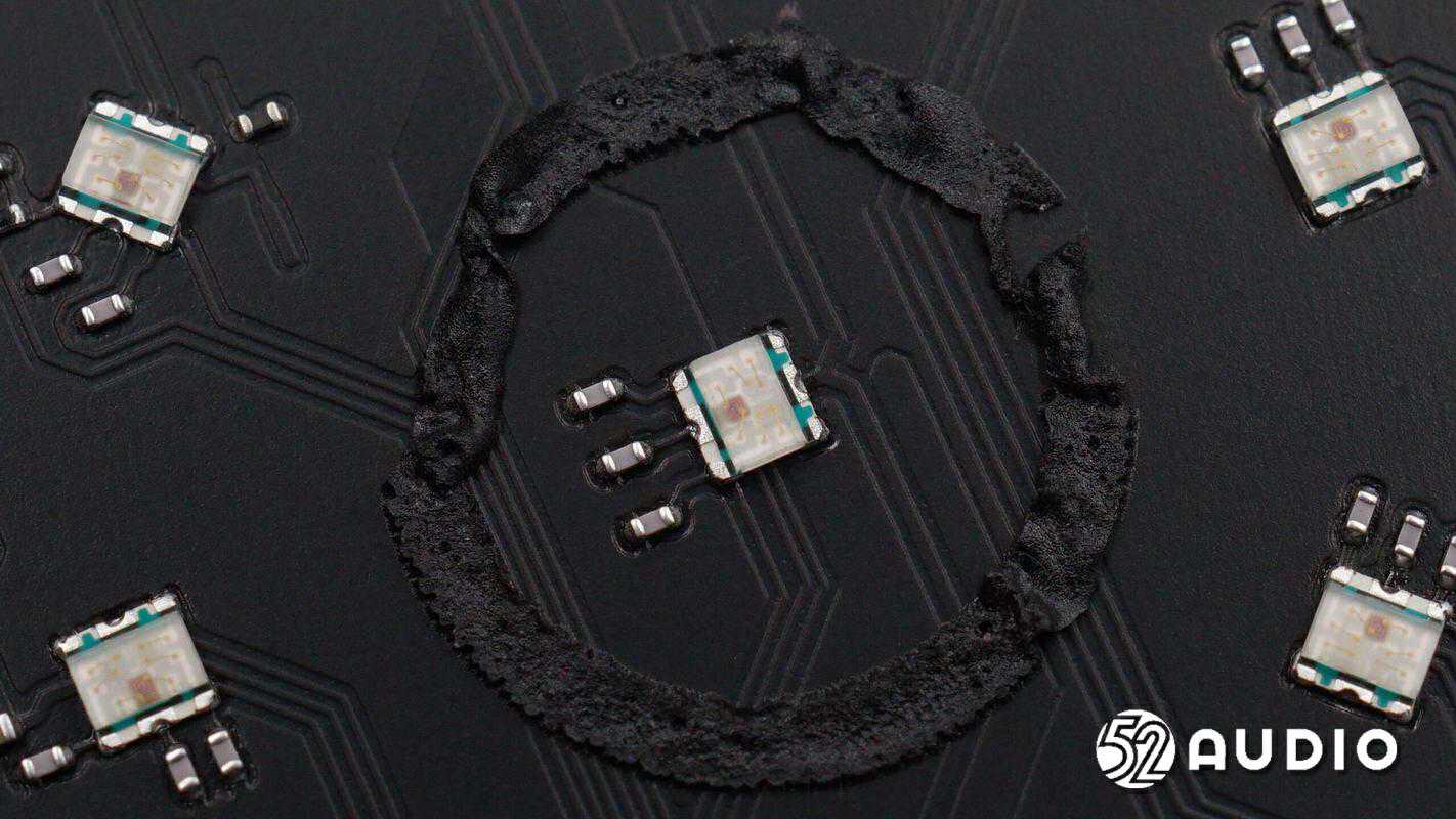 拾音麦克风特写,同样通过黑色硬质胶水密封,整个PCB板上总共搭载有四颗相同规格的拾音麦克风。