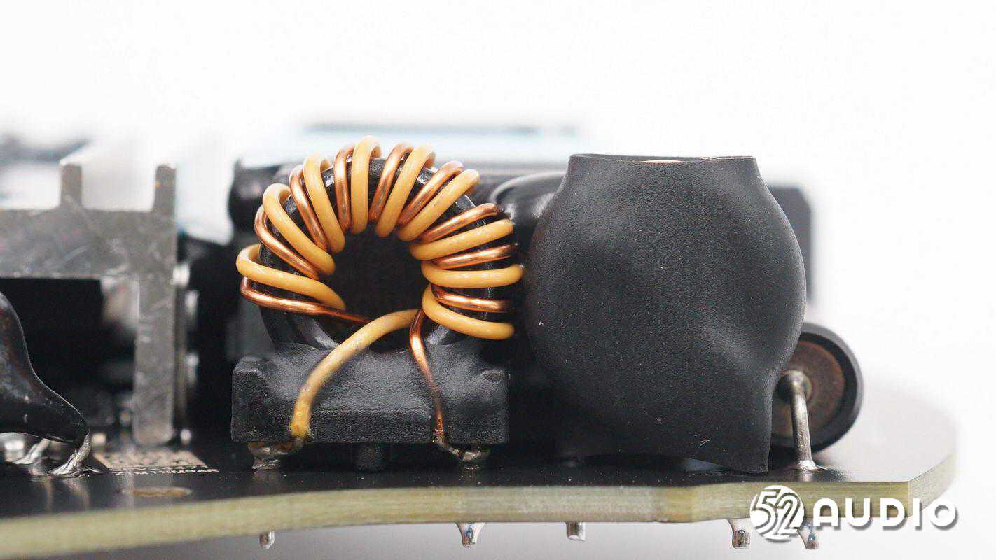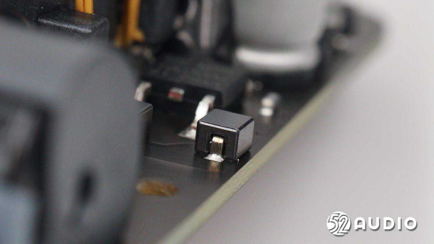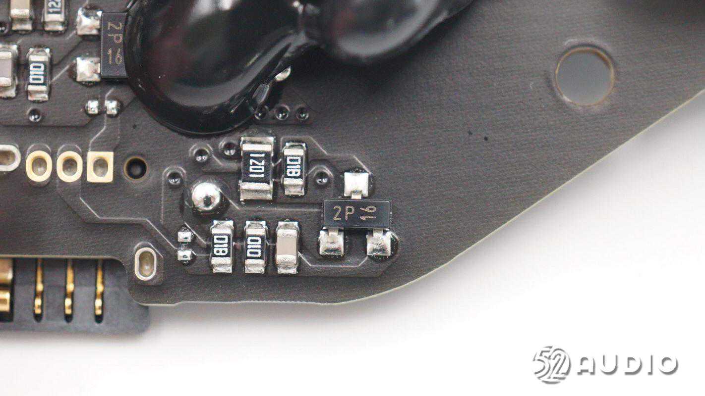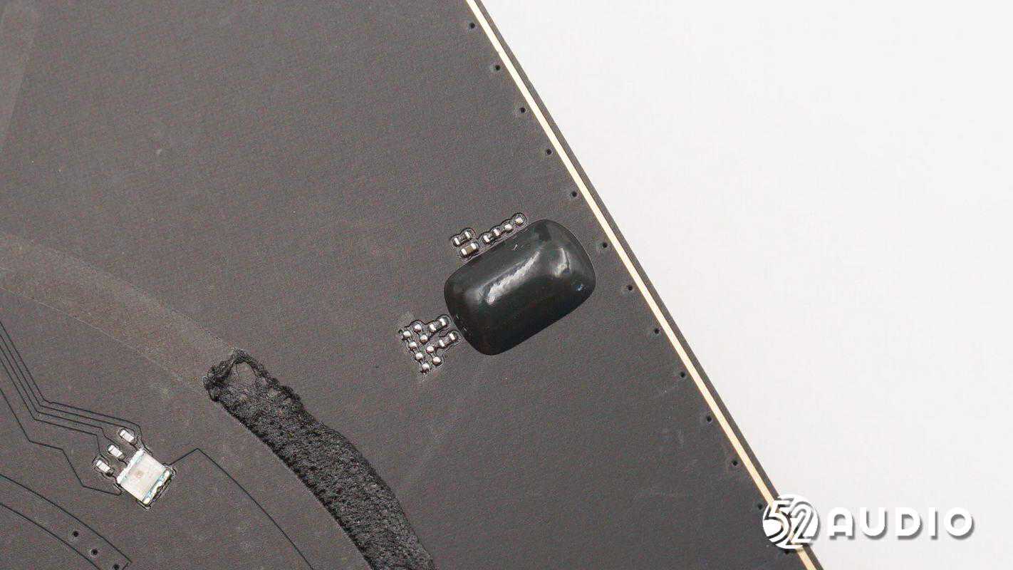 主板上的低音均衡器麦克风特写,通过硬质胶水密封,用于监测低音单元声音,实现动态调整低频部分。