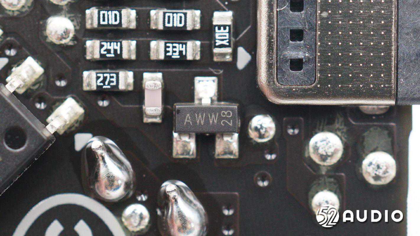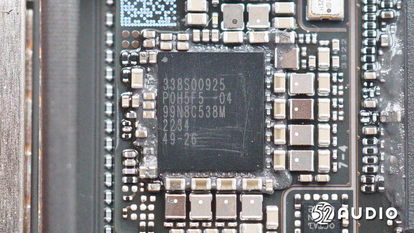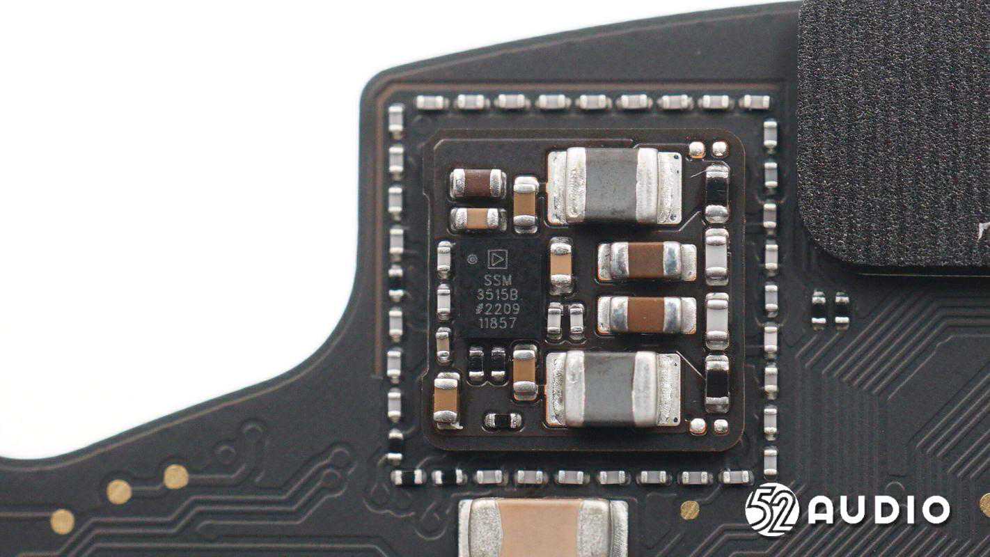 镭雕802oKSM1的MEMS麦克风特写,用于监测低音单元音频,进行动态调整。